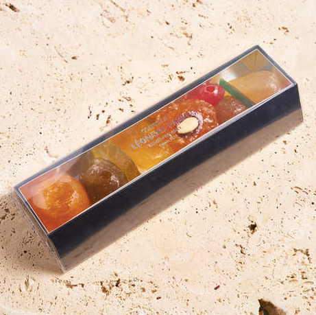 This elegant box contains an exquisite selection of assorted candied fruits, a gourmet specialty of Maison Léonard Parli.