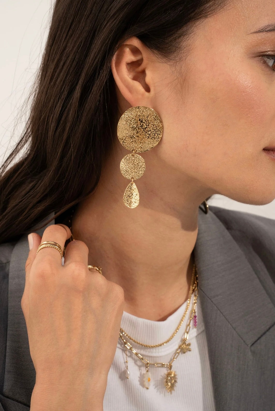 Stainless steel drop earrings composed of 3 flat, textured pieces.