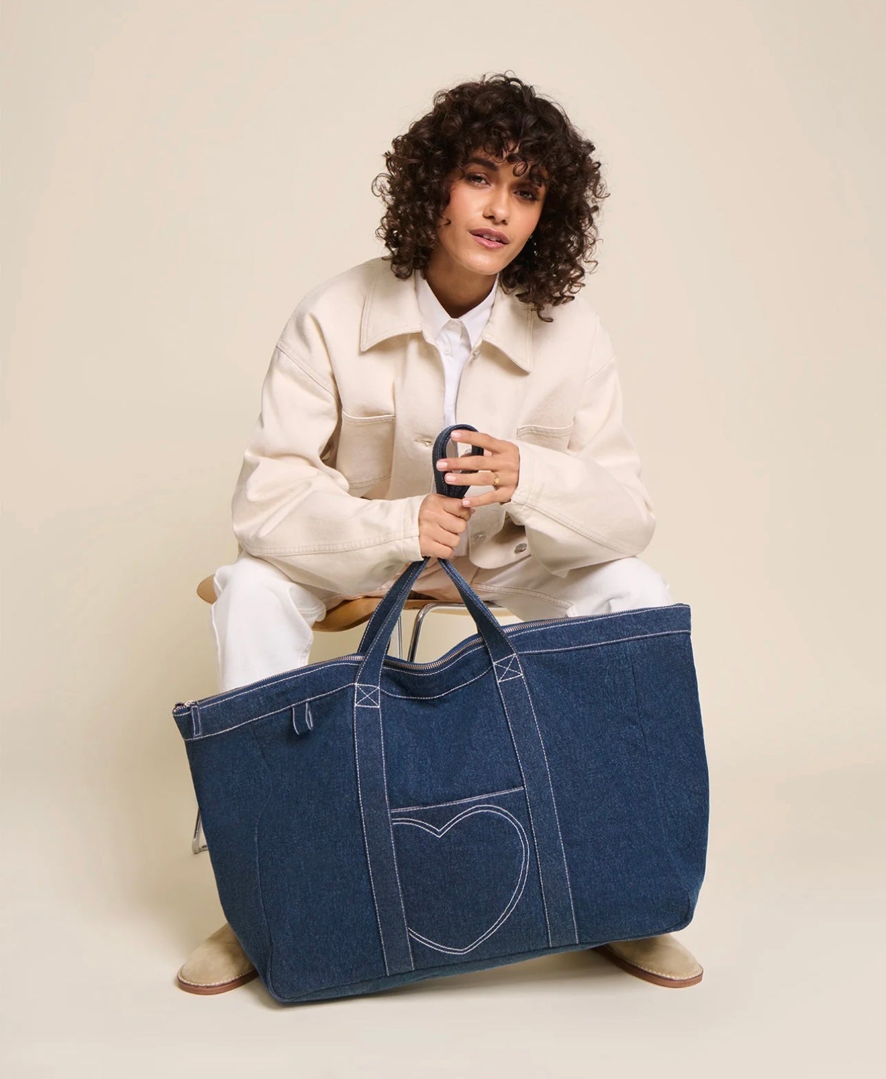The accessory with a tender heart, embroidered in a big way. After jeans, shirts, and workwear, it's time for our essential accessories. On the agenda: a flat clutch, a toiletry bag, a wallet, a crossbody bag straight out of the 2000s, and a large zippered tote. Our denim essentials adapt to our lives. Not the other way around.