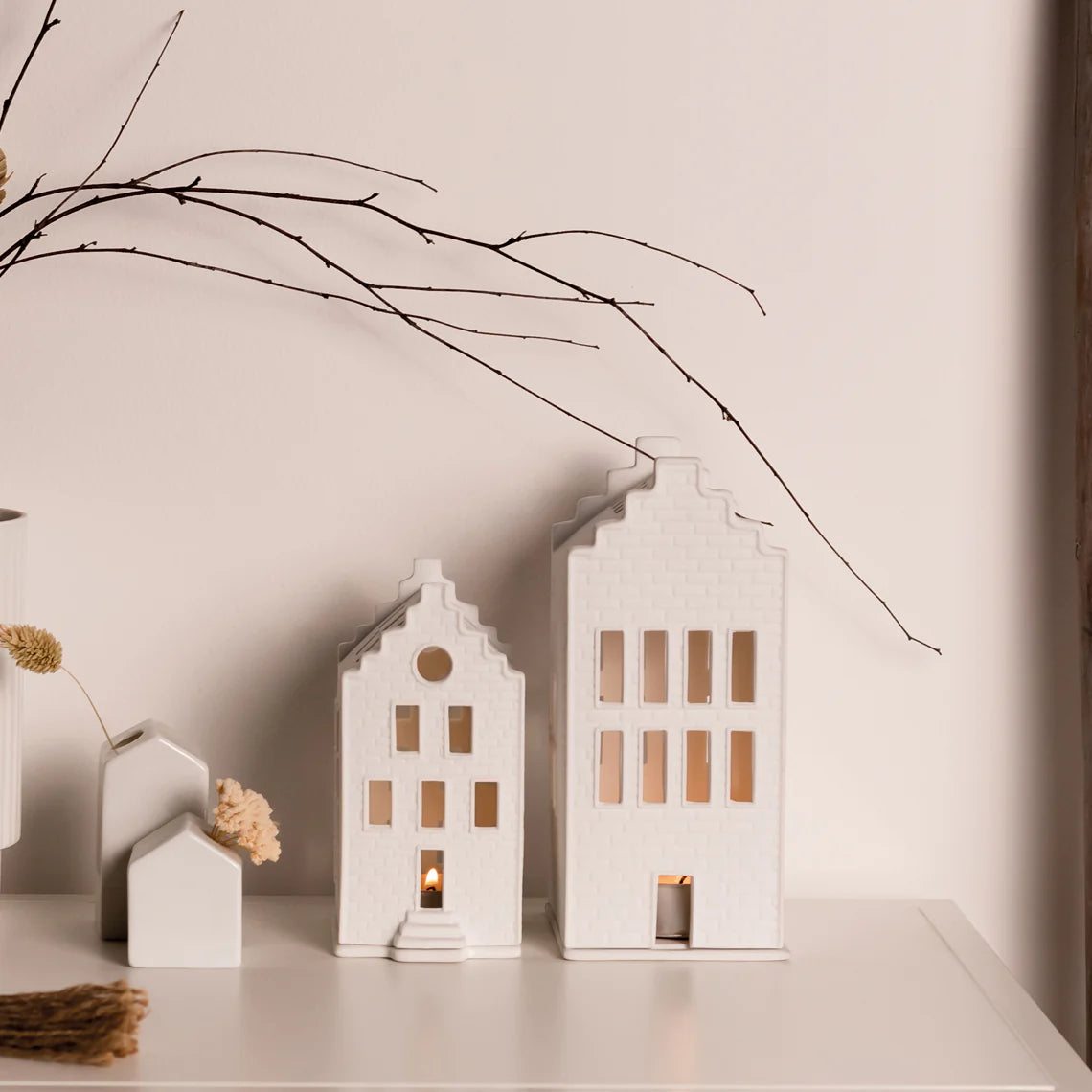 Beautiful Village House Brick House with Stepped Gable is a work of mason craftsmanship. Beautiful brick work combined with the architectural feature of a stepped roof, make this home a wonder of detail. Beautiful white porcelain features sculptural texture. Home is reminiscent of older homes in Holland and Germany. House sits atop a porcelain base plate. Available in multiple sizes.