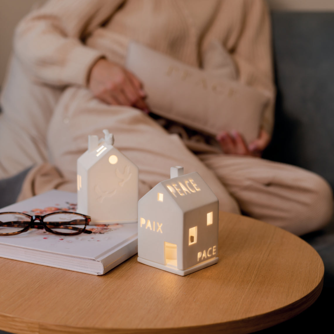 Bring a warm glow and a meaningful message into your home with the brand Peace House Tealight Holder & Sculpture. Crafted from unglazed white porcelain, this charming house-shaped sculpture features cut-out windows, doors, and the word "Peace" expressed in multiple languages, along with a peace symbol. Designed to hold a tealight candle, it casts a soft, ambient light that radiates through the cut-outs, creating a peaceful atmosphere. Whether displayed on a shelf or as a part of your festive décor, this piece beautifully shows a minimalist design with a powerful symbol of peace.