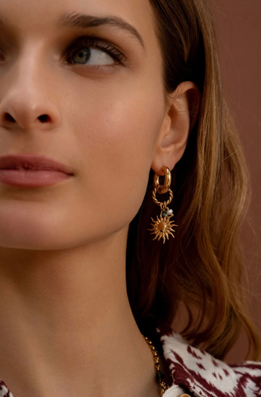 Hoop earrings with hinged clasps featuring a mother-of-pearl flower with an enameled center.