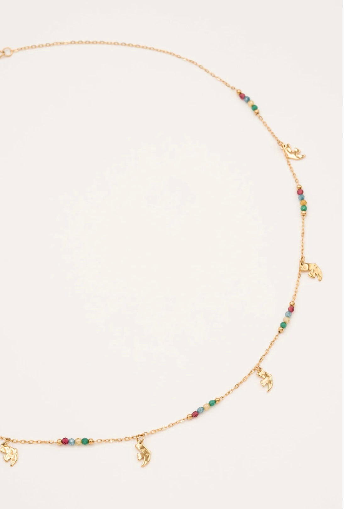 Stainless steel chain necklace featuring a fine cable link with small crystal beads and bird charms.
