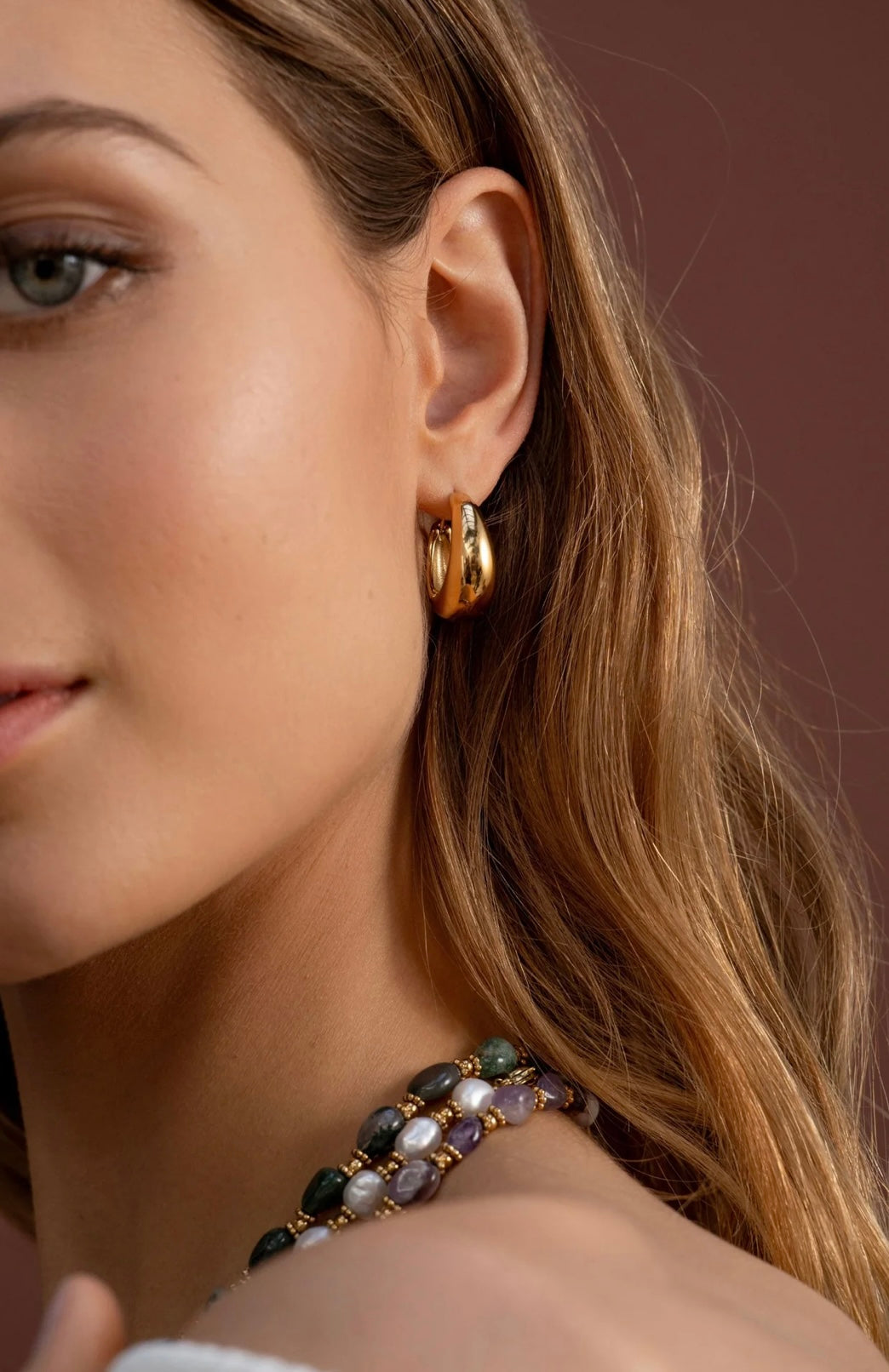 Stainless steel hoop earrings with hinged clasps, featuring a curved, hollow hoop.